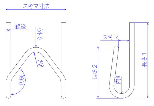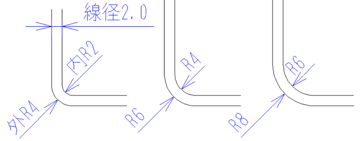 ※最小R(内R)は線径1本分程度。小さいRは曲げ加工時に使用する【芯金】【スピナ】と呼ばれる部品が折れてしまうことがあります